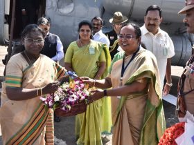 வேலூர் ஸ்ரீபுரம் ஸ்ரீ நாராயணி பீடத்துக்கு வருகை தந்த இந்திய குடியரசு தலைவர் திரௌபதி முர்முவுக்கு பூங்கொத்து கொடுத்து வரவேற்பு அளித்த கைத்தறி துணி நூல் துறை அமைச்சர் காந்தி, வேலூர் மாநகராட்சி மேயர் சுஜாதா. அருகில் தமிழ்நாடு ஆளுநர் ஆர். என். ரவி.