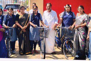 வேலூர் வேலப்பாடி வி கே விநாயக முதலியார் அரசினர் மேல்நிலைப்பள்ளி மாணவிகளுக்கு எம்எல்ஏ கார்த்திகேயன் சைக்கிள் வழங்கினார் அருகில் மேயர் சுஜாதா மாமன்ற உறுப்பினர் அஸ்மிதா கோபிநாதன் தலைமை ஆசிரியர் சித்ரா ஆகியோர் உடன் இருந்தனர்