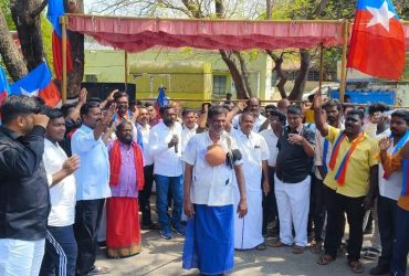 பஞ்சமி நிலங்களை மீட்டு தரக் கோரி’எச்சில் துப்பும் சட்டியை’ கழுத்தில் தொங்க விட்டப்படி வி.சி.க.,வினர் உண்ணாவிரதப் போராட்டம் !