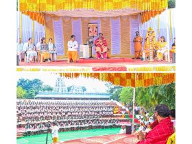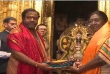 வேலூர் ஸ்ரீபுரம் ஸ்ரீ நாராயணி பீடத்துக்கு வருகை தந்த இந்திய குடியரசு தலைவர் திரௌபதி முர்முவுக்கு பட்டுவஸ்திரம் கொடுத்து வரவேற்பு அளித்த வேலூர் ஸ்ரீ புரம் ஸ்ரீ நாராயணி பீடாதிபதி ஸ்ரீ சக்தி அம்மா.