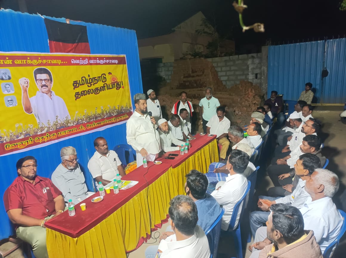 வேலூர் மாவட்டம், பேரணாம்பட்டு நகராட்சி 18வது வார்டில் என் சாவடி என் வெற்றிச் சாவடி தலைப்பிலான திமுக பொதுக்கூட்டம் நடைபெற்றது. இக்கூட்டத்திற்கு மூத்த நகர மன்ற உறுப்பினர் டி. அப்துல் ஜமீல் தலைமை தாங்கினார். 18வது வார்டு நகர மன்ற உறுப்பினர் கே. தேன்மொழி தாஸ் வரவேற்றார். இதில் பேரணாம்பட்டு நகர மன்றத்தை கடந்த 20 ஆண்டுகளாக திமுகவின் கோட்டையாக வைத்துக் கொண்டிருக்கும் திமுக நகர செயலாளரும், நகர மன்ற துணைத் தலைவருமான ஆழியார் ஜூபேர் அகமது சிறப்பு விருந்தினராக கலந்து கொண்டு சிறப்புரையாற்றினார். இதில் நகர மன்ற தலைவர் வி. பிரேமா வெற்றிவேல், நகர திமுக துணை செயலாளர் பி. சின்னா (எ) பொற்கைப் பாண்டியன், வேலூர் மாவட்ட திமுக துணை செயலாளர் எம். பிரபாத்குமார், நகரமன்ற உறுப்பினர்கள் எஸ். நுரேசபா அர்சத் அகமத், எல். சின்ன லாசர், எம்.பாரதி , நஜீஹா ஜூபேர் அஹமத் ,எஸ். இந்திரா காந்தி சரவணன், முன்னாள் நகர மன்ற உறுப்பினர்கள் கே. ராஜவேலு, சித்திக் அகமத், ஜெ. கங்காதரன் உட்பட மற்றும் பலர் கலந்து கொண்டனர்.