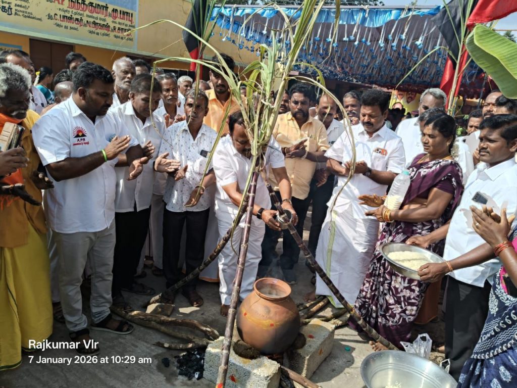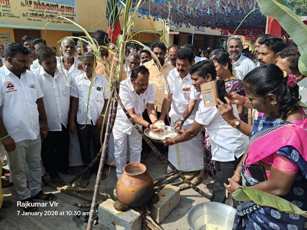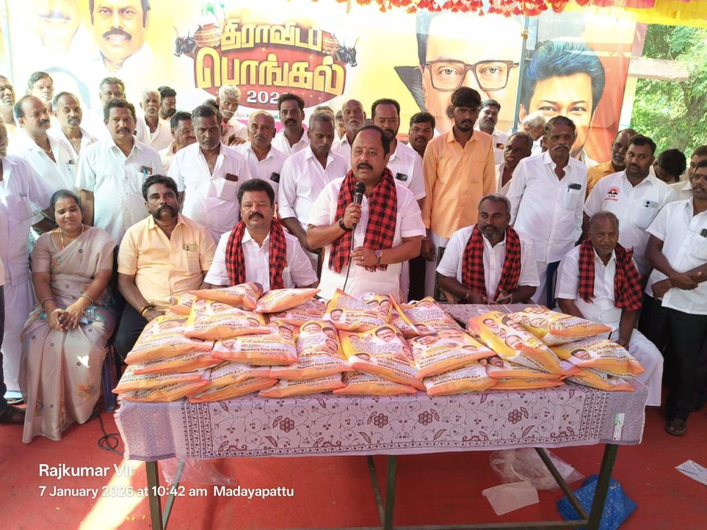 திமுக தலைவர் மற்றும் தமிழ்நாடு முதலமைச்சருமான தங்கதளபதி மு. க. ஸ்டாலின் ஆணைக்கிணங்க, வேலூர் தெற்கு மாவட்டம், அணைக்கட்டு சட்டமன்ற தொகுதி, மேற்கு ஒன்றியம் சார்பில் திராவிடப் பொங்கல் விழா மற்றும் புடவை, வேட்டிகள் வழங்கும் நிகழ்ச்சி மடையப்பட்டு ஊராட்சியில் நடைபெற்றது. இதில் திமுக வேலூர் தெற்கு மாவட்ட செயலாளரும், அணைக்கட்டு தொகுதி சட்டமன்ற உறுப்பினருமான ஏ. பி. நந்தகுமார் கலந்து கொண்டு பானையில் பொங்கல் வைத்து சிறப்புரையாற்றி பொதுமக்களுக்கு புடவை, வேட்டிகள், பொங்கல் தொகுப்பு ஆகியவற்றை வழங்கினார். இந்த எளிய நிகழ்ச்சியில் மாவட்ட ஊராட்சி குழு தலைவர் மு.பாபு, பேரூராட்சி செயலாளர் ஆர்.பெருமாள் ராஜா, ஒன்றிய கவுன்சிலர்கள் ஆர்.சாரதி, கணபதி, ஊராட்சி மன்ற தலைவர் கவிதா மதுகுமார், கிருஷ்ணமூர்த்தி மற்றும் உள்ளாட்சி பிரதிநிதிகள், திமுக நிர்வாகிகள், தொண்டர்கள், பொது மக்கள் திரளாக கலந்து கொண்டு விழாவை சிறப்பித்தனர்.