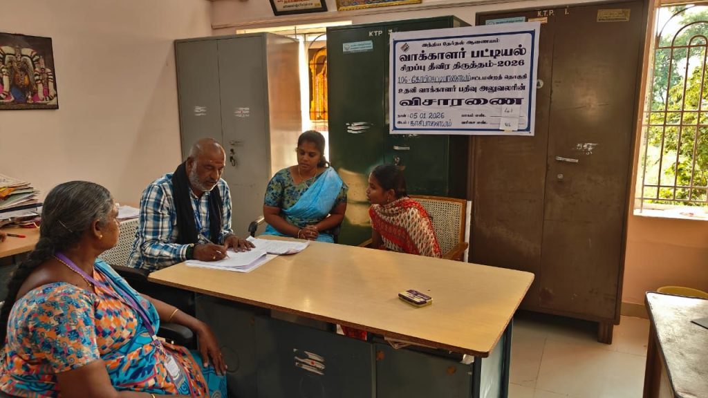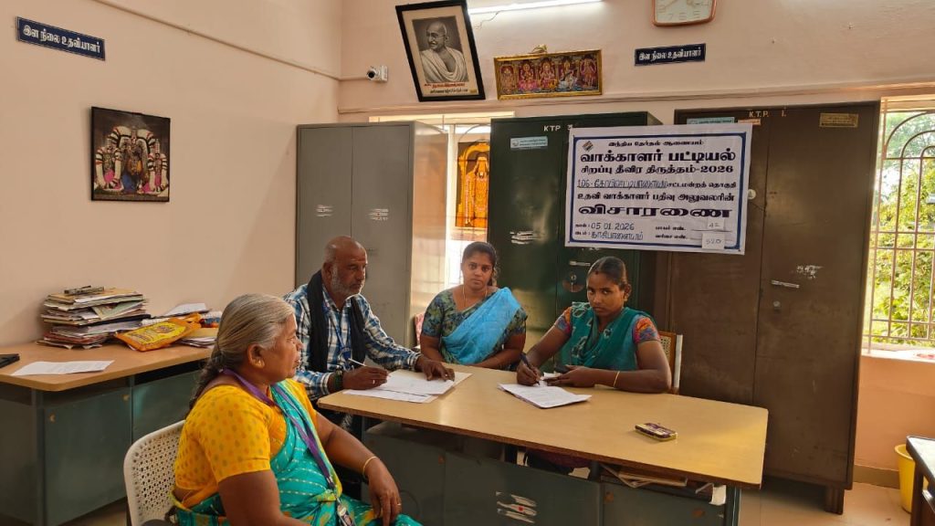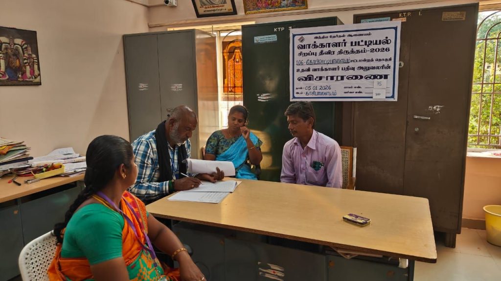 ஈரோடு மாவட்ட ஆட்சித்தலைவர் அவர்கள் மற்றும் கோபிசெட்டிபாளையம் சார் ஆட்சியர் அவர்களின் ஆய்வு கூட்ட அறிவுரையின்படியும் ஈரோடு மண்டல பேரூராட்சிகளின் உதவி இயக்குநர் அவர்கள் மற்றும் கோபிசெட்டிபாளையம் வருவாய் வட்டாட்சியர் அவர்களின் அறிவுரைக்கிணங்க காசிபாளையம் (கோபி) பேரூராட்சியில் வாக்காளர் பட்டியல் தீவிர திருத்தம் 2026ல் மேற்பார்வையாளர் திருமதி. ராதாமணி பாகம் எண்.34,35,36,37,38 க்கும், மேற்பார்வையாளர் செல்வி. பவித்ரா பாகம் எண். 39,40,41,42 க்கும் உதவி வாக்காளர் பதிவு அலுவலர் (AERO) திரு. இரா. மணிகண்டன் மற்றும் உதவி வாக்காளர் பதிவு அலுவலரின் உதவியாளர் திரு. க. மகுடேஸ்வரன் ஆகியேரால் Unmaping List தொடர்பான விசாரணை நடைபெற்றது. Unmaping List 89 எண்ணிக்கையில் 81 எண்ணிக்கை விசாரணை செய்து சரிபார்க்கப்பட்டது. மீதமுள்ள 8 எண்ணிக்கை வாக்காளர்கள் 06.01.2026ம் தேதி விசாரணை செய்து 100 சதவீதம் Unmaping List தொடர்பான விசாரணை முடிக்கப்பட்டது