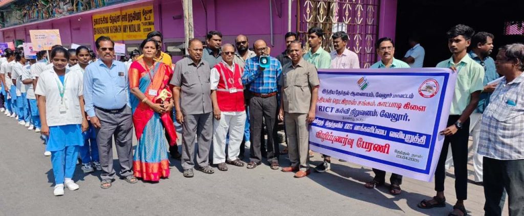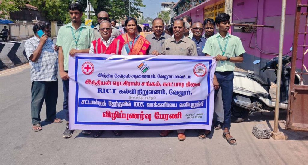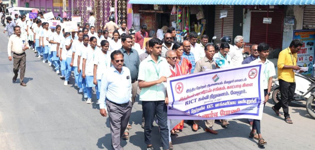 இந்திய தேர்தல் ஆணையத்தின் வழிகாட்டுதலின்படி, 23.04.2026 ல் நடைபெற உள்ள சட்டமன்ற பொதுத் தேர்தலில் 100 சதவீதம் வாக்காளர்கள் வாக்களிக்க வேண்டும் என்பதை வலியுறுத்தி விழிப்புணர்வு பேரணியானது இந்தியன் ரெட் கிராஸ் சங்கம், ஆர். ஐ. சி. டி.,கல்வி நிறுவனம், வேலூர் மாவட்ட இந்திய தேர்தல் ஆணையத்துடன் இணைந்து பேரணி நடைபெற்றது.
