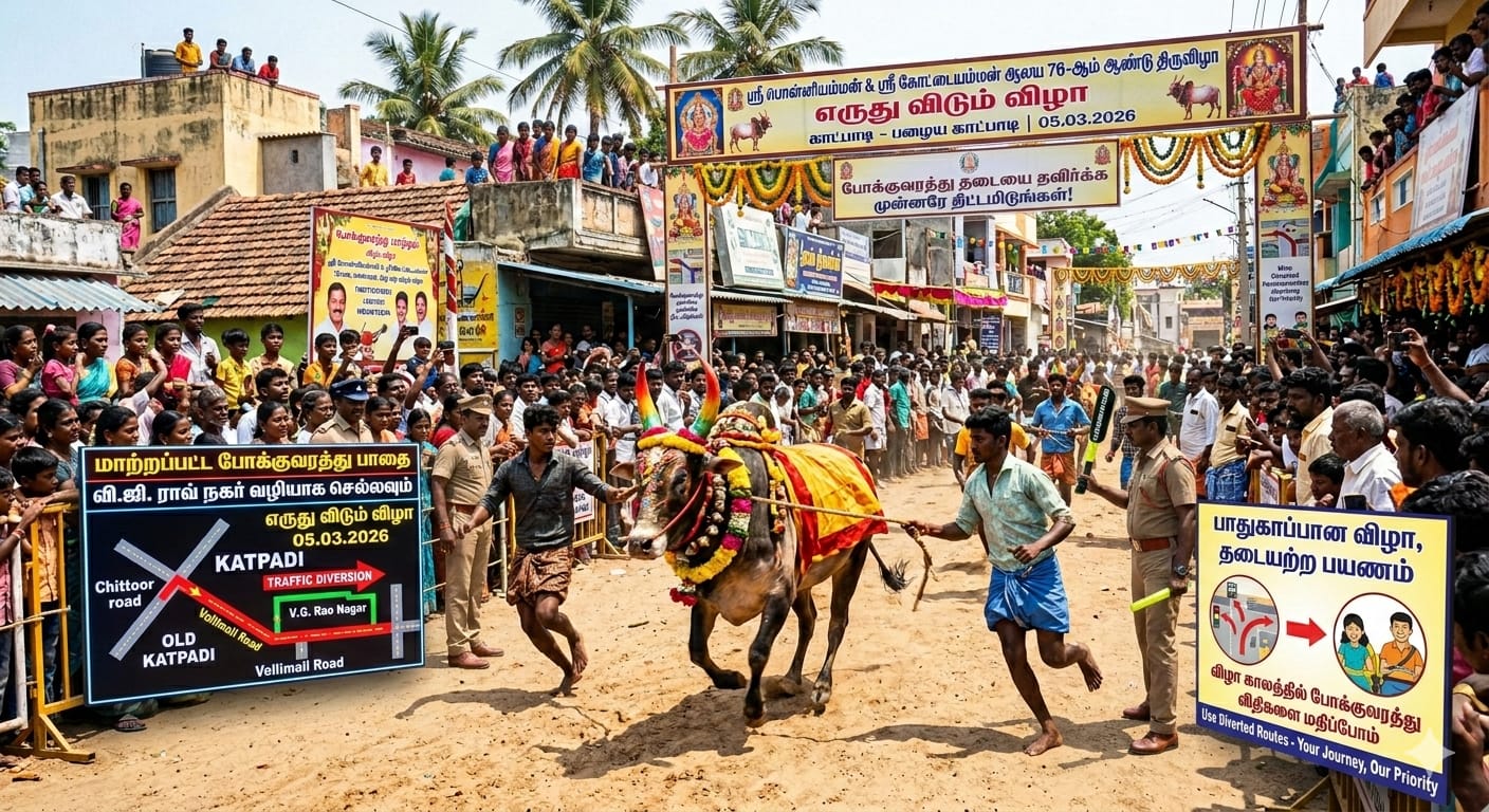 வேலூர் மாவட்டம், காட்பாடி காவல் நிலைய எல்லைக்குட்பட்ட பழைய காட்பாடி பகுதியில், ஸ்ரீ பொன்னியம்மன் மற்றும் ஸ்ரீ கோட்டையம்மன் (எ) ரேணுகாம்பாள் ஆலயத்தின் 76-ஆம் ஆண்டு திருவிழா விமரிசையாக நடைபெற்று வருகிறது. இந்த விழாவினை முன்னிட்டு வரும் மார்ச் 5-ஆம் தேதி அன்று எருது விடும் திருவிழா நடைபெற உள்ளது.