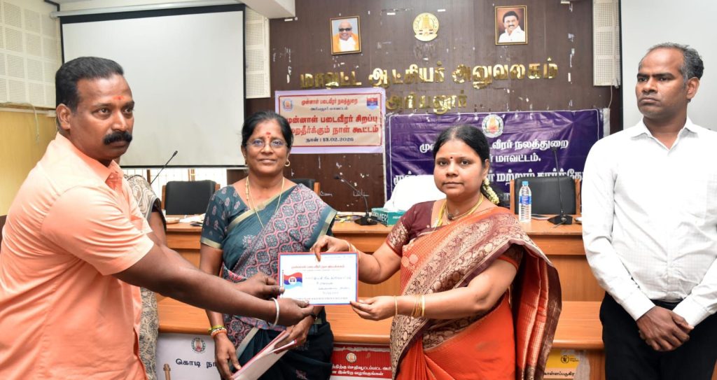 அரியலூர் மாவட்ட ஆட்சியர் அலுவலகக் கூட்டரங்கில், “முன்னாள் படை வீரர்களுக்கான சிறப்பு குறை தீர்க்கும் நாள் கூட்டம்”;; மாவட்ட வருவாய் அலுவலர் மல்லிகா அவர்கள் தலைமையில் இன்று (13.02.2026) நடைபெற்றது.இக்கூட்டத்தில் முன்னாள் படைவீரர்கள் மற்றும் சார்ந்தோர்களிடமிருந்து அவர்களது குறைகள் மற்றும் கோரிக்கைகள் கேட்கப்பட்டதுடன் அவர்களிடமிருந்து பல்வேறு கோரிக்கைகள் தொடர்பாக 11 மனுக்கள் பெறப்பட்டது. இம்மனுக்கள் மீது உடனடி நடவடிக்கை மேற்கொள்ள சம்மந்தப்பட்ட அலுவலர்களுக்கு அறிவுறுத்தப்பட்டுள்ளது.தொடர்ந்து, முன்னாள் படைவீரர் நலத்துறை சார்பில் 17 நபர்களுக்கு ரூ.5,94,000 மதிப்பில் பல்வேறு நலத்திட்ட உதவிகளை மாவட்ட வருவாய் அலுவலர் மல்லிகா அவர்கள் வழங்கினார்.