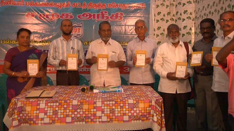 அனைத்து பல்கலைக்கழக ஆசிரியர்கள் சங்க நிர்வாகிகள் திரளானோர் பங்கேற்ற இக்கூட்டத்தில் தனியார் கல்லூரிகளை தனியார் பல்கலைக்கழகமாக்க சட்டதிருத்த மசோதா 2025 சமூக அநீதி என்ற புத்தகம் வெளியிடப்பட்டது.