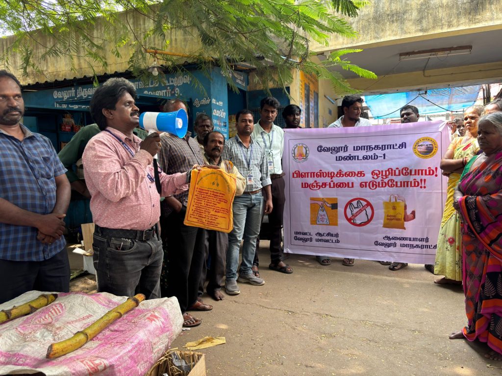 வேலூர் மாநகராட்சி காட்பாடி உழவர் சந்தையில் பிளாஸ்டிக் தடை விழிப்புணர்வு நிகழ்ச்சி!