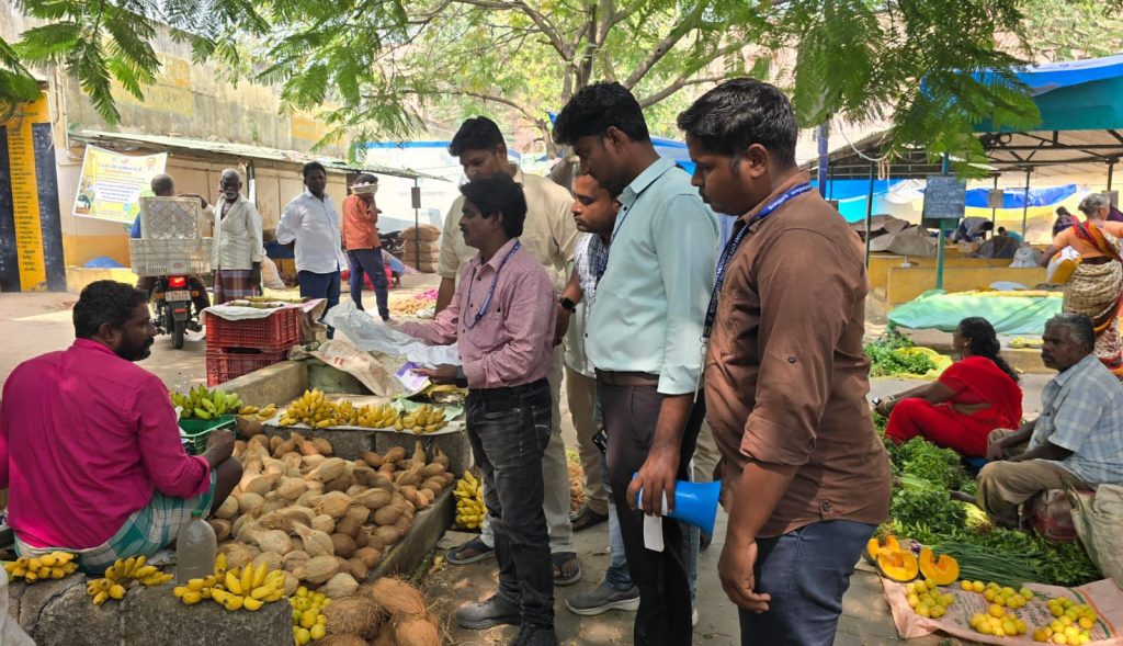 விழிப்புணர்வு வழங்கப்பட்டது. நூற்றுக்கும் மேற்பட்ட வியாபாரிகளும், பொதுமக்களும் கலந்து கொண்டனர். துப்புரவு ஆய்வாளர்கள், துப்புரவு மேற்பார்வையாளர்கள், அனிமேட்டர்கள் உடன் இருந்தனர்.