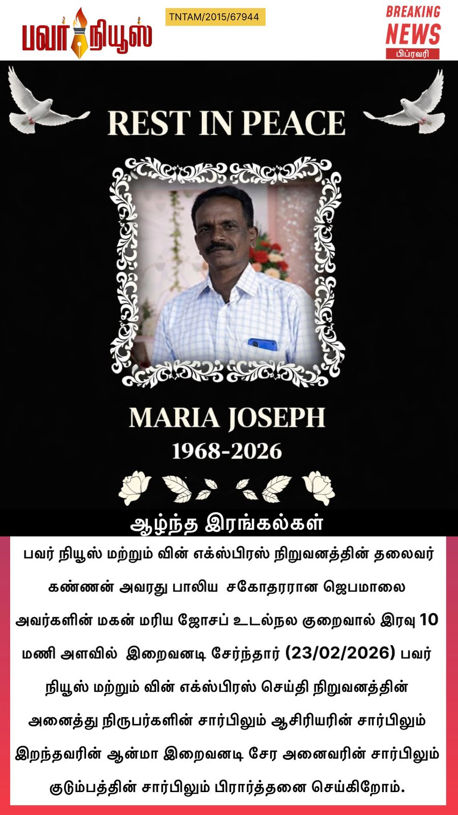 பவர் நியூஸ் மற்றும் வின் எக்ஸ்பிரஸ் குழுமத்தின் நிறுவனர் மற்றும் ஆசிரியர் G. கண்ணனின் பால்ய சகோதரரான ஜெப மாலையின் புதல்வர் ஜெ. மரிய ஜோசப் உடல்நலக்குறைவால் நேற்று இரவு (23-02-2026) இயற்கை எய்தினார் என்பதை அறிவிக்க வருந்துகிறோம். அவரை இழந்து வாடும் அவர்கள் குடும்பத்தினருக்கும், நண்பர்களுக்கும் மற்றும் உறவினர்களுக்கும் ஆழ்ந்த இரங்கலை தெரிவித்துக் கொள்கிறோம்.