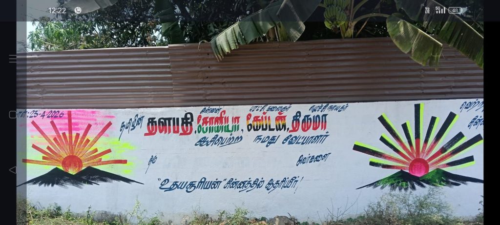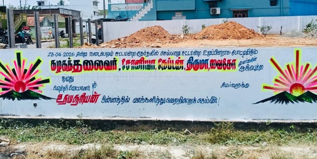 செய்யாறு சட்டசபை தொகுதிக்கு தி.மு.க., சார்பில் சுவரொட்டி விளம்பரம் ‘ரெடி’ இதில், தேர்தல் தேதி – பதிவாகி விட்டது. கூட்டணி கட்சி தலைவர்களின் பெயர்களும் எழுதியாச்சி, சுவற்றில் சின்னமும் உதிக்க தொடங்கிவிட்டன. ‘திரு என்று தொடங்கி — என்னும் முடியும் இடத்தில் யார் பெயர் இடம் பெறப்போகிறது. அந்த வரிசையில் முதல் இடத்தில் ஏழாச்சேரி எம்.கே. கார்த்திகேயனும், இரண்டாம் இடத்தில் ‘சிட்டிங்’ எம்.எல்.ஏ., ஜோதியும், மூன்றாம் இடத்தில் பார்வதி சீனுவாசன், நான்காம் இடத்தில் மாமண்டூர் ராஜ் என தொகுதி மக்களால் பரவலாக பேசப்படுவது காதுகளுக்கு கேட்கிறது. மக்கள் செல்வாக்கை கொண்டவர் யார்? அவர் பொறுத்திருந்து பார்ப்போம். தி.மு.க., சார்பில் இந்த சுவரொட்டி விளம்பரம் செய்யாறு அடுத்த வெம்பாக்கம் கிராமத்தில் எழுதப்பட்டுள்ளது.