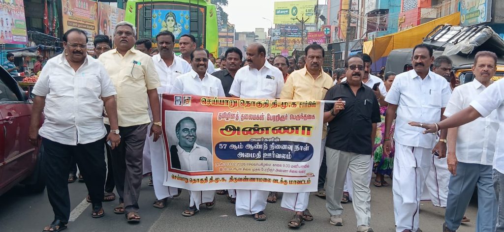 முன்னாள் முதல்வர் பேரறிஞர் அண்ணாதுரையின் 57வது நினைவு தினத்தையொட்டி, செய்யாறில் ஜோதி எம்.எல்.ஏ., தலைமையில் அமைதி ஊர்வலம் நடந்தது.