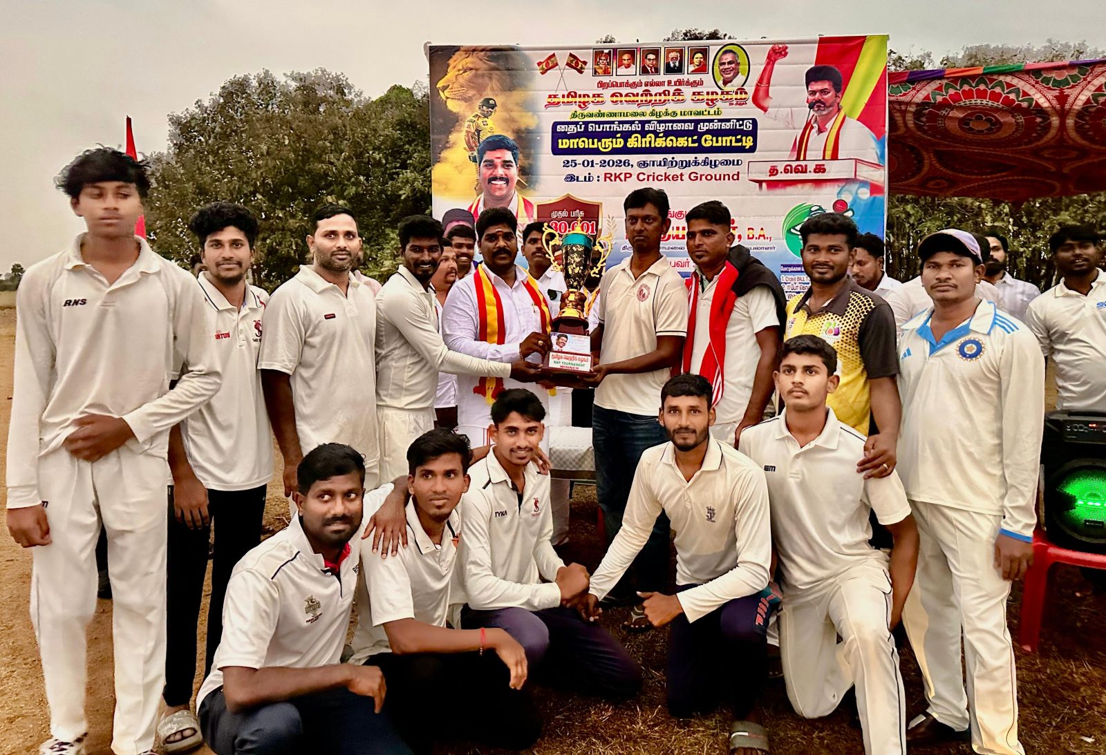 செய்யாறில் தமிழக வெற்றி கழகம் சார்பில் மாவட்ட அளவிலான கிரிக்கெட் போட்டிகள் நடத்தப்பட்டு முதல் மூன்று இடங்களைப் பிடித்த அணிகளுக்கு கிழக்கு மாவட்ட செயலாளர் உதயகுமார் பரிசு கோப்பைகளை வழங்கி கௌரவித்தார்.