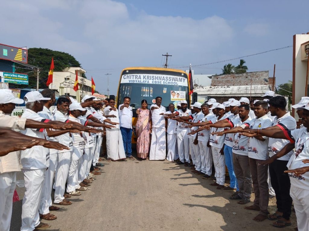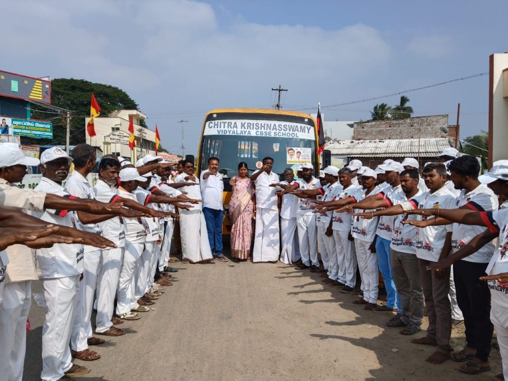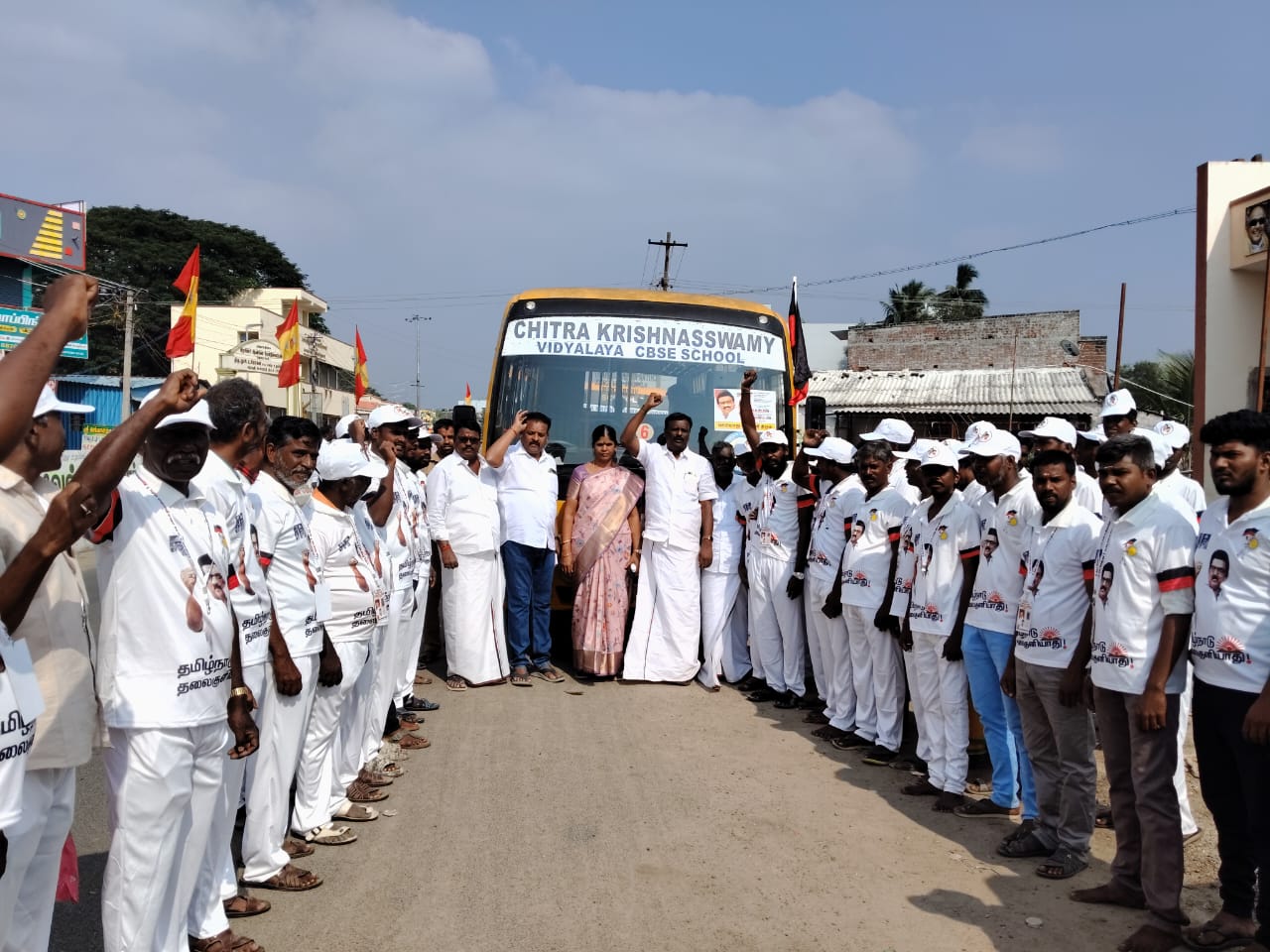 ஜே.சி.கே.சீனுவாசன், மாவட்ட முன்னாள் ஊராட்சி குழு தலைவர் பார்வதிசீனுவாசன் ஆகியோர் தலைமையில் 500க்கும் மேற்பட்ட இளைஞர்கள் உறுதி மொழி ஏற்று 6 வாகனங்களில் புறப்பட்டு சென்றபோது எடுத்த படம்.