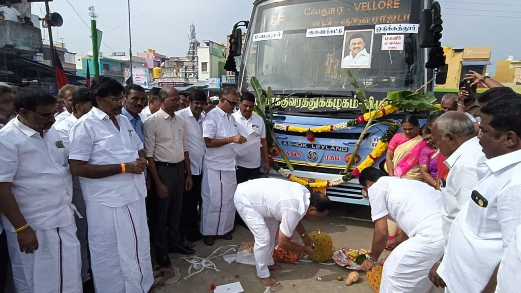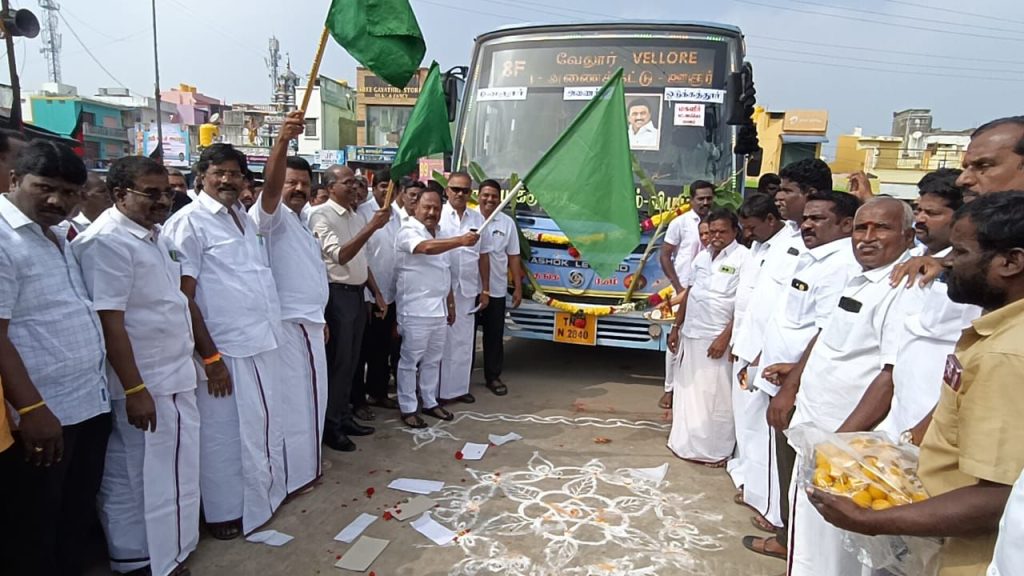 மகளிர் விடியல் பயணம் பேருந்து வழித்தடம் தொடக்க விழா நடந்தது. விழாவில் வேலூர் தெற்கு மாவட்ட செயலாளரும், அணைக்கட்டு சட்டமன்ற உறுப்பினருமான ஏ. பி. நந்தகுமார் கலந்து கொண்டு கொடியசைத்து புதிய பேருந்து வழித்தடத்தை தொடங்கி வைத்தார். இதில் மாவட்ட ஊராட்சி குழு தலைவர் மு.பாபு, மத்திய ஒன்றிய செயலாளர் பி. வெங்கடேசன், கிழக்கு ஒன்றிய செயலாளர் கோ.குமரபாண்டியன்,